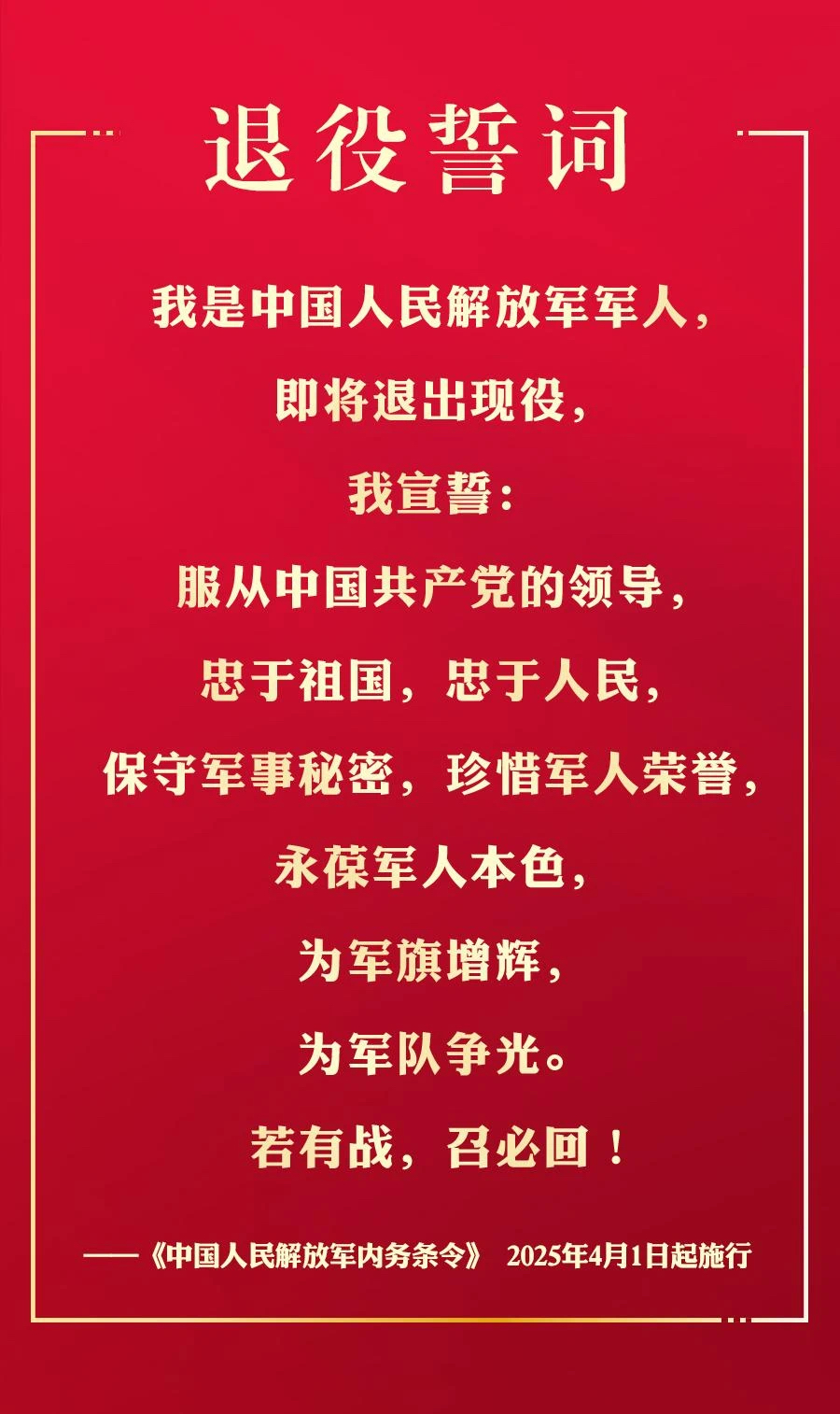新修订通过的《中国人民解放军内务条令》,自2025年4月1日起施行。条令中明确公布退役誓词。