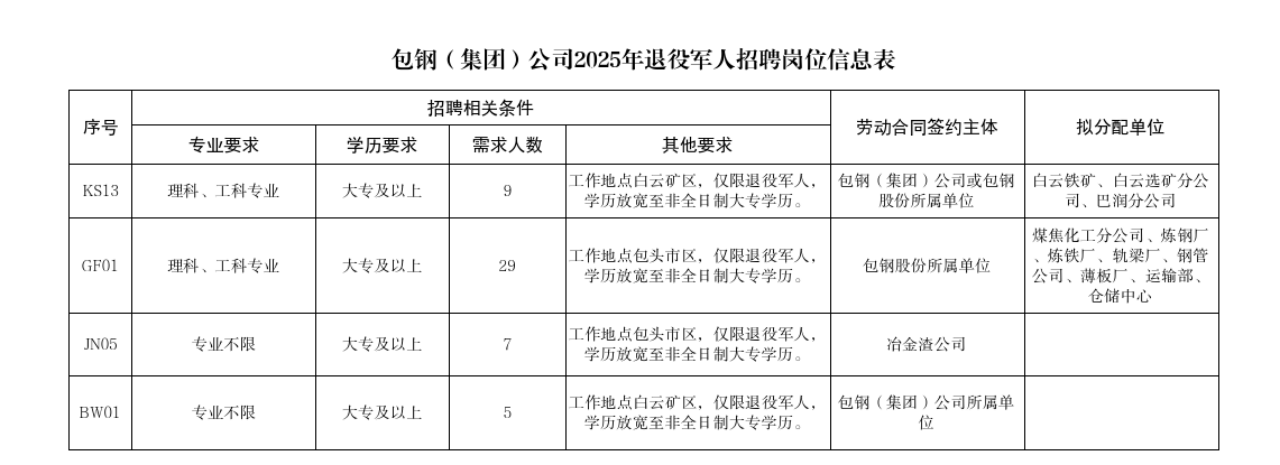 近日,包钢(集团)公司2025年新员工招聘公告发布,计划招聘580人,其中,招聘退役军人专岗50人。